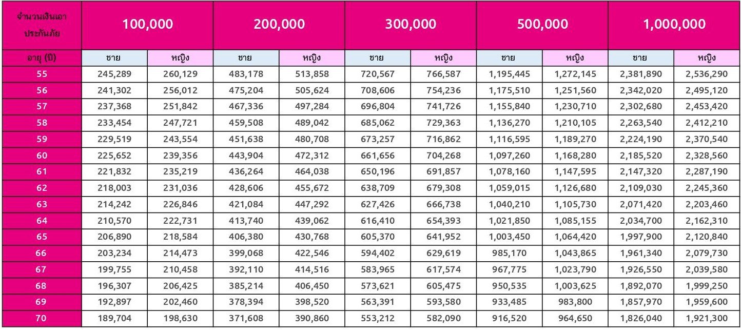 - อายุที่รับประกันภัย : อายุ 55 -70 ปี
