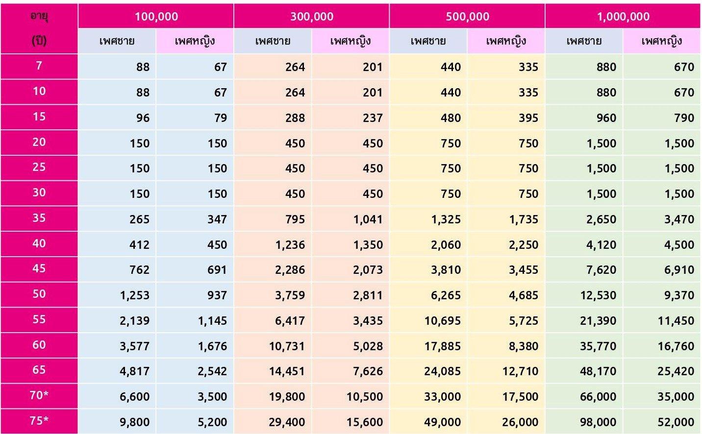 - อายุที่รับประกันภัย : 7 - 65 ปี (ต่ออายุได้ถึง 79 ปี ให้ความคุ้มครองถึงอายุ 80 ปี)