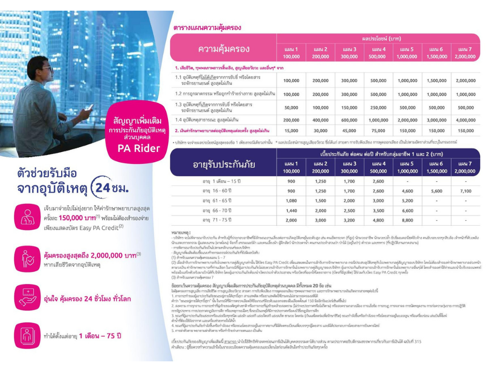 • อายุ  16 – 60 ปี : รับประกันภัยได้ไม่เกิน 5,000,000 บาท และเมื่อรวมกับทุนประกันภัยของ P.A.และสัญญาเพิ่มเติมอุบัติเหตุอื่นๆ แล้วทุนประกันภัยรวมต้องไม่เกิน 10,000,000 บาท กรณีที่จำนวนเงินเอาประกันภัยเกินกว่าที่กำหนด บริษัทจะพิจารณาเป็นรายๆ ไป