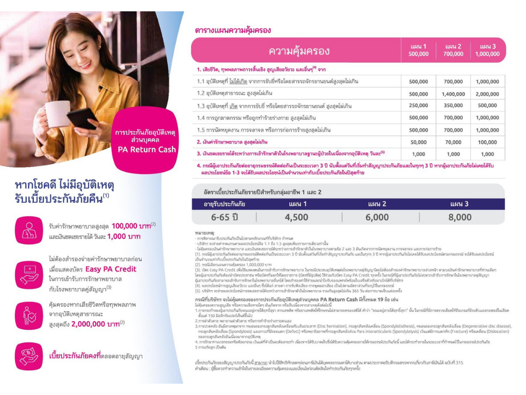 - ไม่ต้องสำรองจ่ายค่ารักษาพยาบาลก่อน เมื่อแสดงบัตร Easy PA Credit ในการเข้ารับการรักษาพยาบาลกับโรงพยาบาลคู่สัญญา