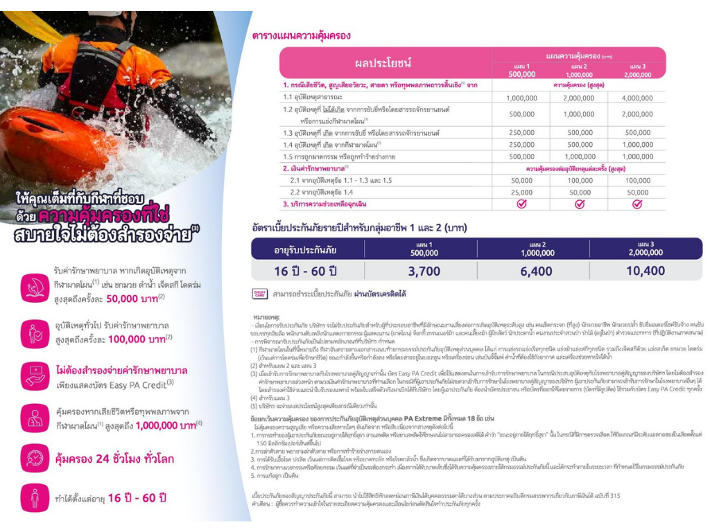 - คุ้มครองหากเสียชีวิตหรือทุพพลภาพ จากกีฬาผาดโผน สูงสุดถึง 1,000,000 บาท