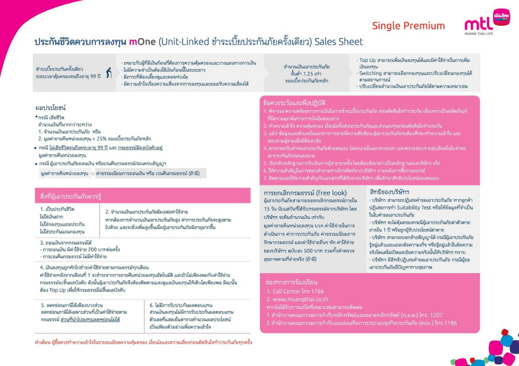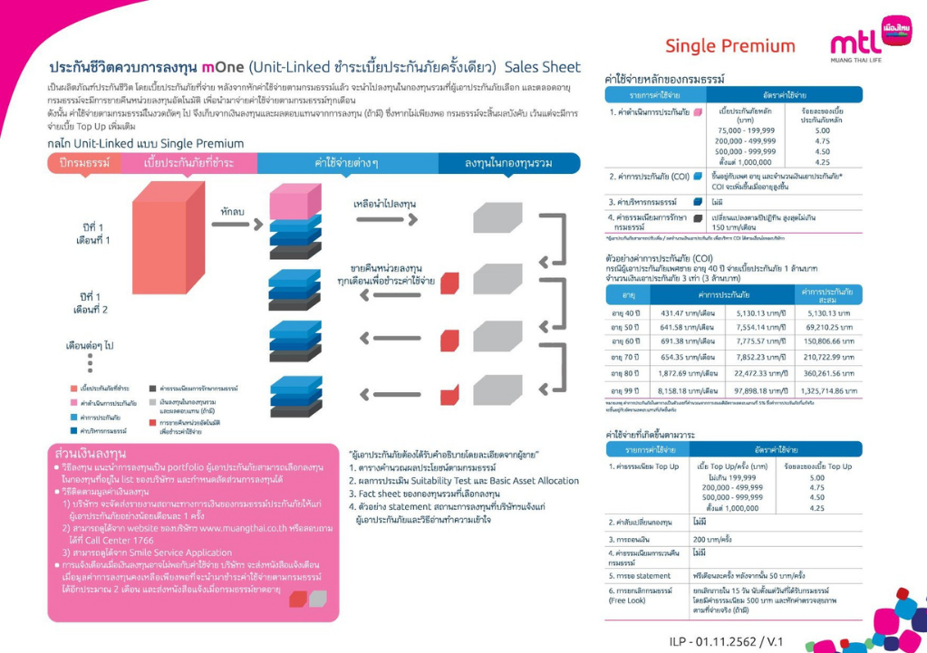 โครงการ mOne เป็นชื่อทางการตลาดของแบบประกันภัยเมืองไทยยูนิตลิงค์ 1 (ชำระเบี้ยประกันภัยครั้งเดียว)