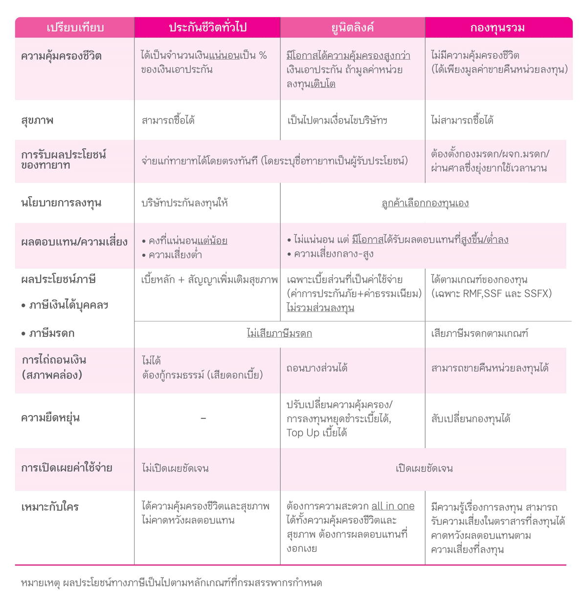 การเปรียบเทียบ ยูนิตลิงค์ กับประกันชีวิตทั่วไป และกองทุนรวม