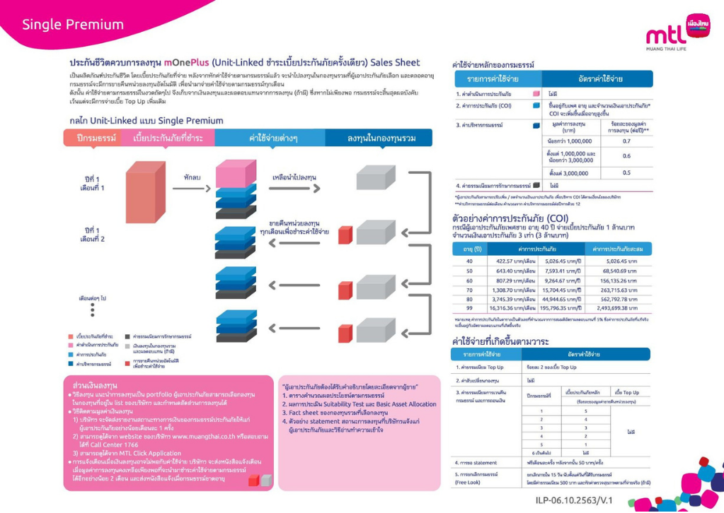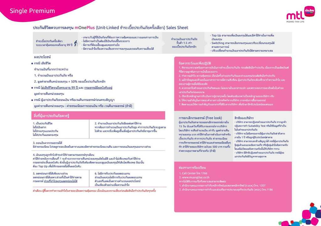โครงการ mOnePlus เป็นชื่อทางการตลาดของแบบประกันภัยเมืองไทยยูนิตลิงค์ 2 (ชำระเบี้ยประกันภัยครั้งเดียว)